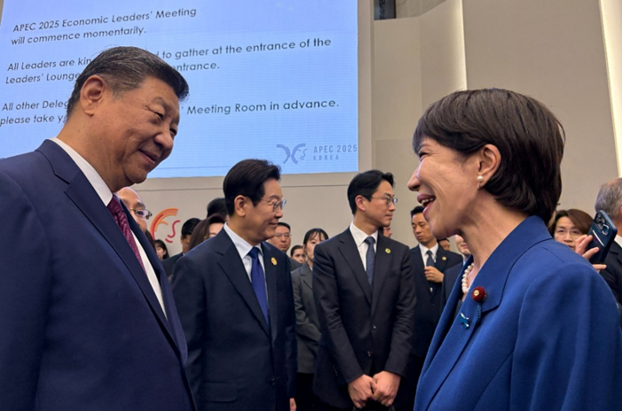 Japanese Prime Minister Sanae Takaichi speaks with Chinese President Xi Jinping near South Korean President Lee Jae Myung at the APEC summit in Gyeongju, October 2025 (photo via X/Twitter @takaichi_sanae)